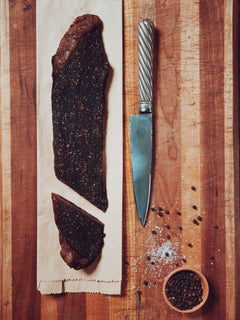 Each slab comes with its natural fat cap intact—the rich, flavorful layer that biltong purists seek out. Seasoned with our traditional spice blend, and dry aged in the time-honored way. What you're getting is pure grass-fed beef with nothing to hide—no sugar, no nitrates, no compromise. Just the craft, handed down and done right.
